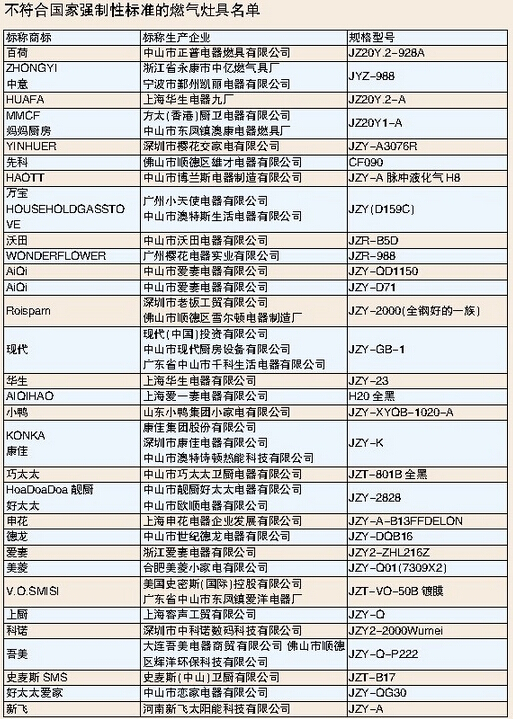此次抽檢依據(jù)GB16410—2007《家用燃?xì)庠罹摺穱?guó)家強(qiáng)制標(biāo)準(zhǔn)的規(guī)定,確定本次家用燃?xì)庠罹叩臋z驗(yàn)項(xiàng)目共20個(gè)。抽檢發(fā)現(xiàn),家用燃?xì)庠罹邩悠分邢ɑ鸨Wo(hù)裝置結(jié)構(gòu)、燃?xì)鈱?dǎo)管、第二道閥門、銘牌、包裝、使用說明書、干煙氣中一氧化碳濃度、熄火、氣密性、熱負(fù)荷偏差、主火實(shí)測(cè)折算熱負(fù)荷、熱效率等12個(gè)項(xiàng)目存在不合格現(xiàn)象,其中除了熱負(fù)荷偏差、主火實(shí)測(cè)折算熱負(fù)荷、熱效率外,其他均為嚴(yán)重不合格項(xiàng)目。
